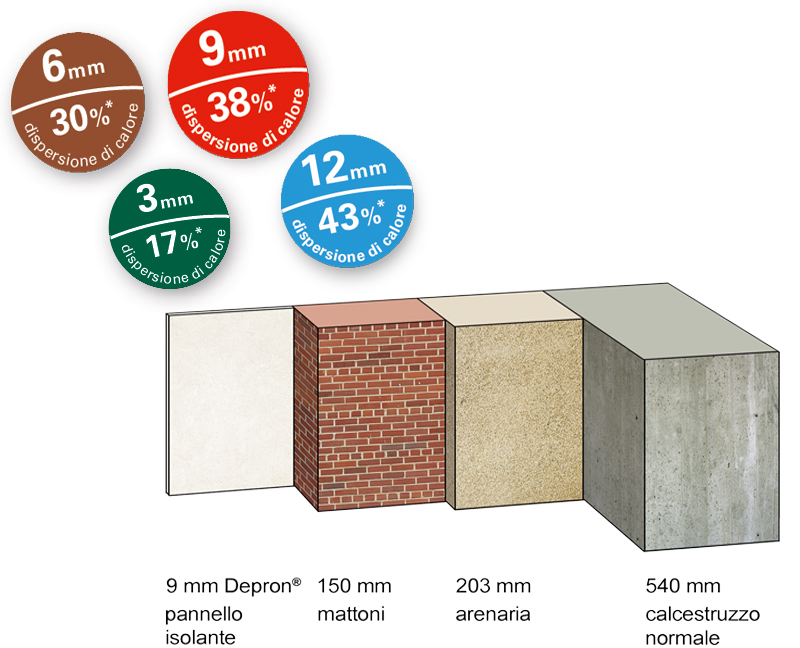 Si tratta di pannelli isolanti in polistirolo espanso estruso di vario spessore, che una volta applicati sulle pareti possono ridurre fino al 38% le perdite di calore; ed anche il tempo di riscaldamento di una stanza è considerevolmente ridotto. L’applicazione dei pannelli Depron protegge contro freddo, umidità e previene la formazione della muffa.